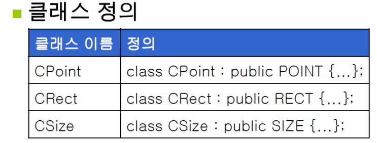 CPoint, CRect, CSize 클래스는 API에서 사용하는 구조체 타입인